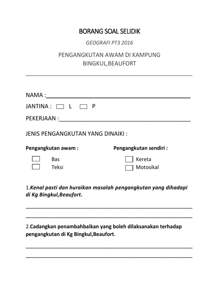 Borang soal selidik tajuk kajian. 1 Konsep dan takrifan sistem pengangkutan. Contoh borang soal selidik geografi pt3 2021 tingkatan 3.